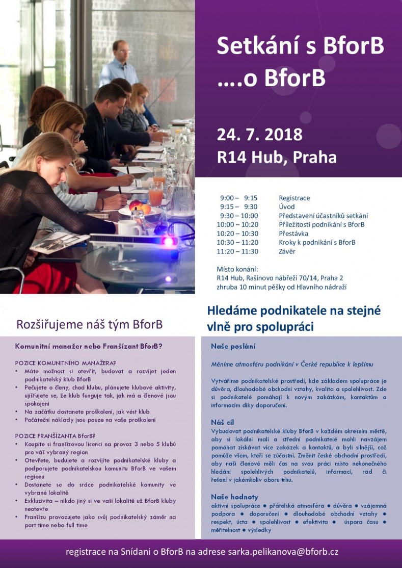 Zveme vás na snídani o BforB, kde se můžeme společně osobně setkat a pohovořit o možnostech spolupráce. Bude prostor mluvit o všem, co vás zajímá, abyste si mohli udělat obrázek, o jakou aktivitu se jedná, zda vás bude bavit a jestli nás bude společná práce bavit.