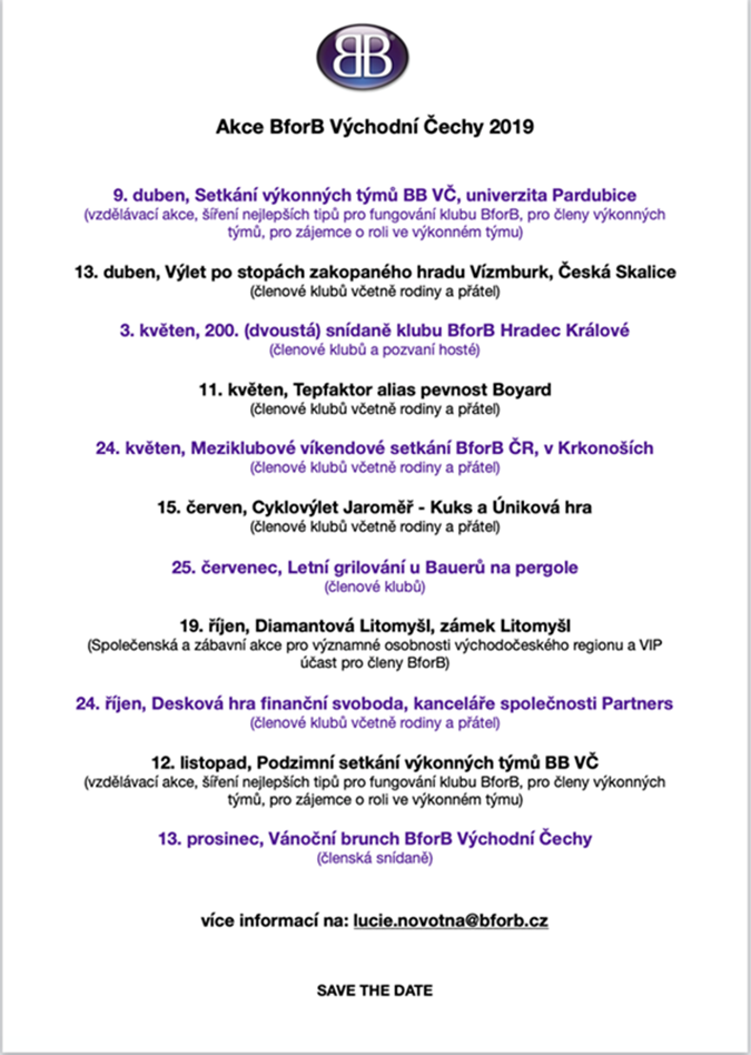Komunita podnikatelů BforB Východní Čechy chystá tyto klubové a meziklubové akce v rámci roku 2019. Členové klubů BforB jiných regionů, zaujme-li Vás nějaká naše akce, napište a přidejte se k nám, těšíme se na Vás.
