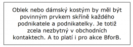 Naopak oblek či dámský kostýmek zdůrazňují profesionalitu, vzbuzují důvěru a respekt. A to jsou hodnoty, na kterých v podnikatelských klubech BforB stavíme.